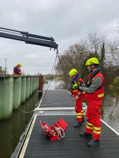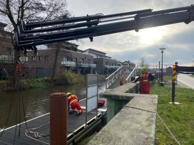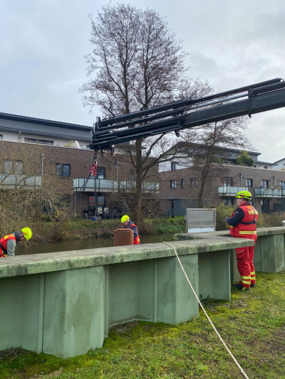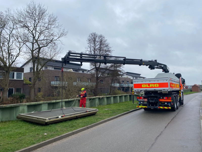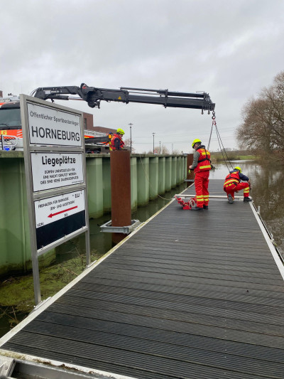 Im Auftrag des Felcken Horneburg wurde die Schlengelanlage im Horneburger Lühe-Hafen durchn die ehrenamtlichen Helfer der DLRG Horneburg/Altes Land demontiert und mit dem WLF-Kran an Land im Winterlager abgelegt.