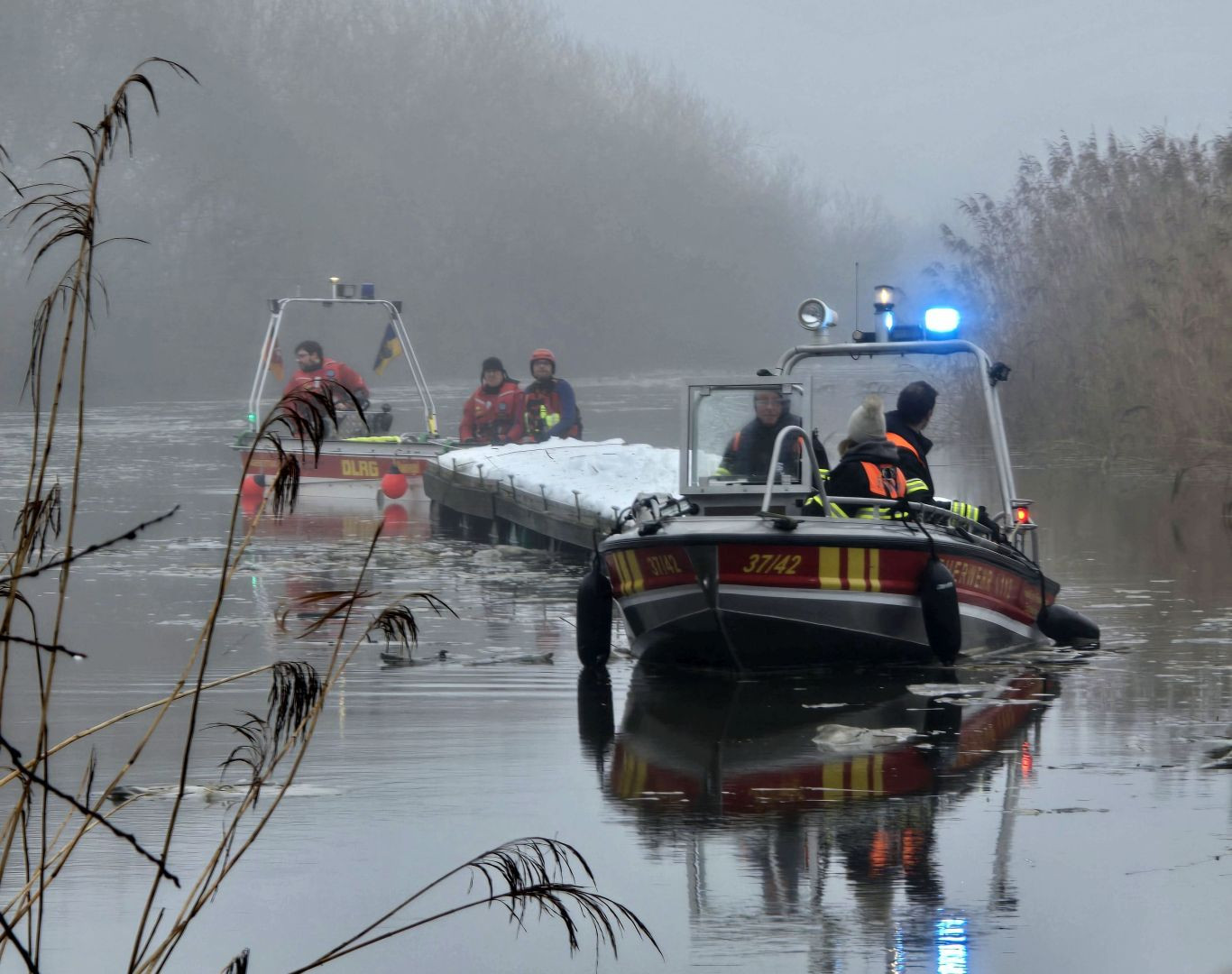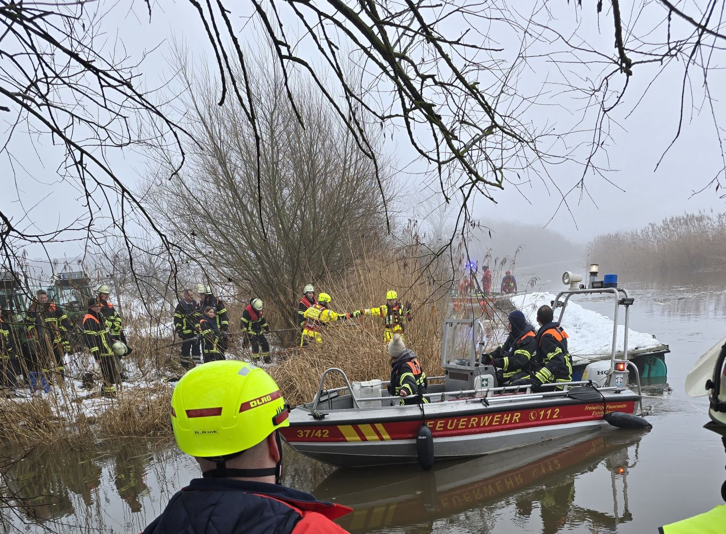 Mit den beiden eingesetzten Rettungsbooten der Feuerwehr Estebrügge und der DLRG Buxtehude konnte der Schlengel schließlich gesichtert und in einen Auslauf eines Schöpfwerks zwischen Estebrügge und Buxtehude geschleppt werden.