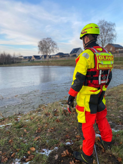 Bei eisigen Temperaturen machten wir uns auf die Suche nach der Ursache. Das Abflussgitter lag rund 1,5 Meter unter Wasser und war zusätzlich mit Pflanzenresten zugesetzt. Nach der Lokalisierung konnten wir das Gitter sowie den unmittelbaren Bereich darum herum freilegen – und das aufgestaute Wasser begann langsam abzulaufen.