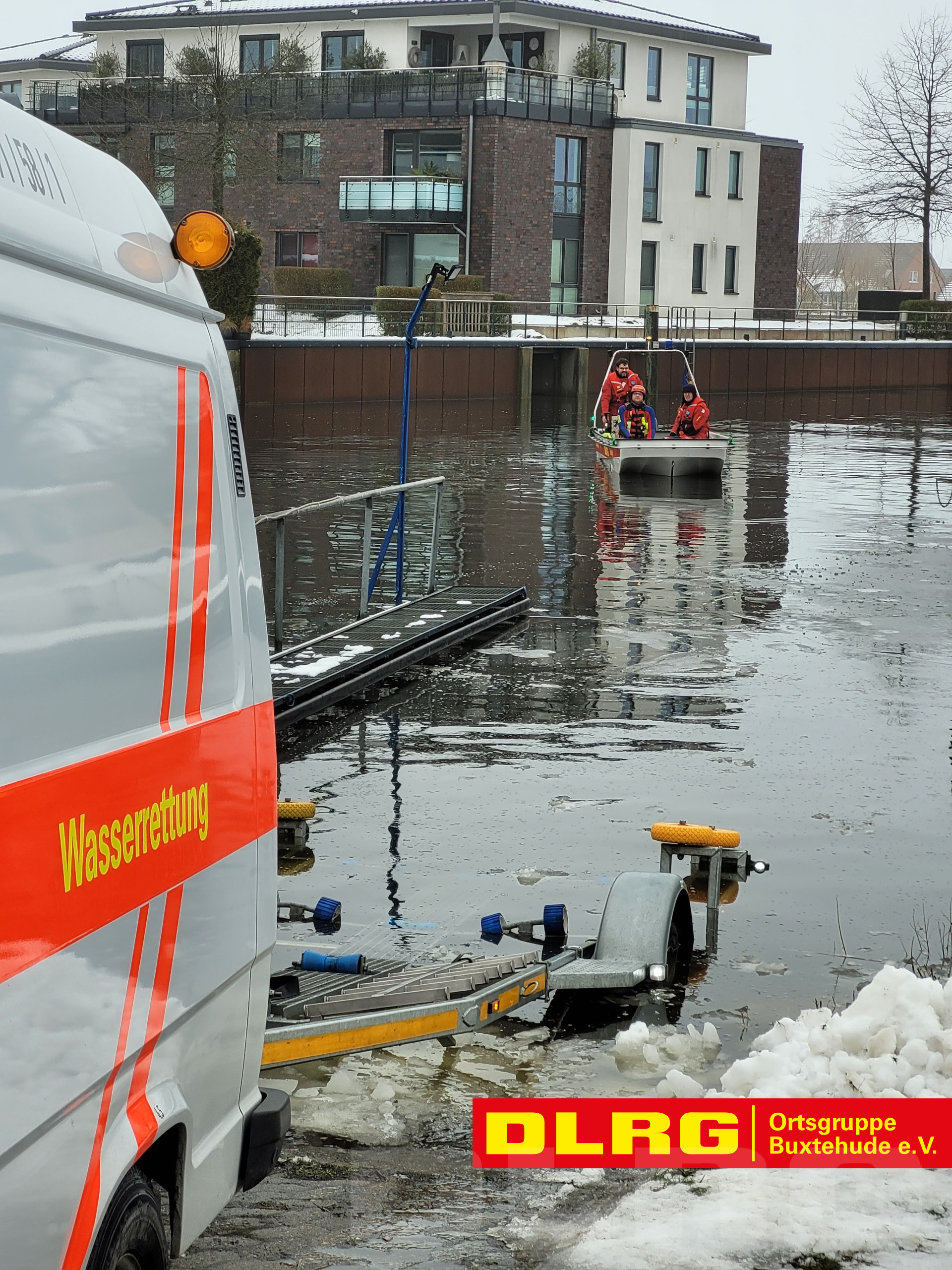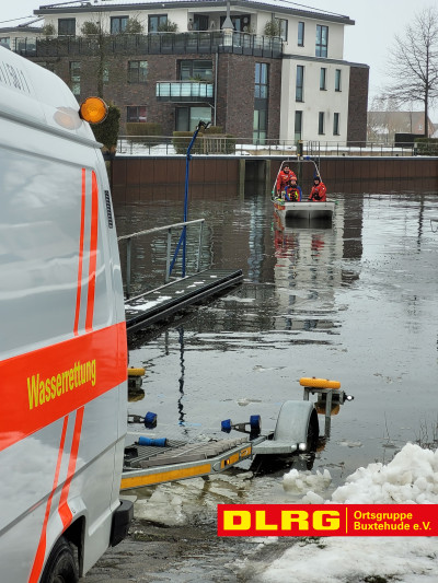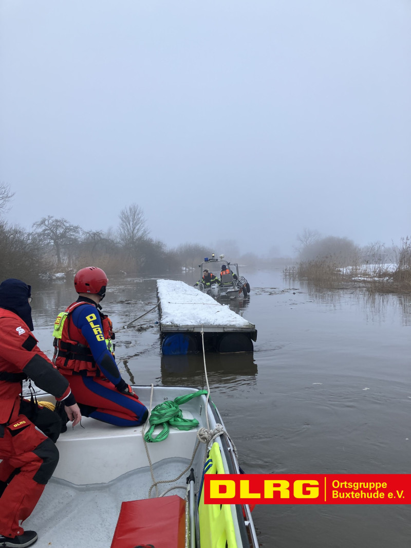 Am heutigen Dienstag wurden unsere Einsatzkräfte um 08:43 Uhr gemeinsam mit der DLRG Ortsgruppe Horneburg/Altes Land und den Feuerwehren aus Estebrügge und Jork durch die Leitstelle Stade zu einem Einsatz auf die Este alarmiert. Passanten hatten gemeldet, dass sich dort ein ca. 15 m langer Bootsanleger losgerissen habe und jetzt mit dem auflaufenden Wasser in Richtung Buxtehude treibt.