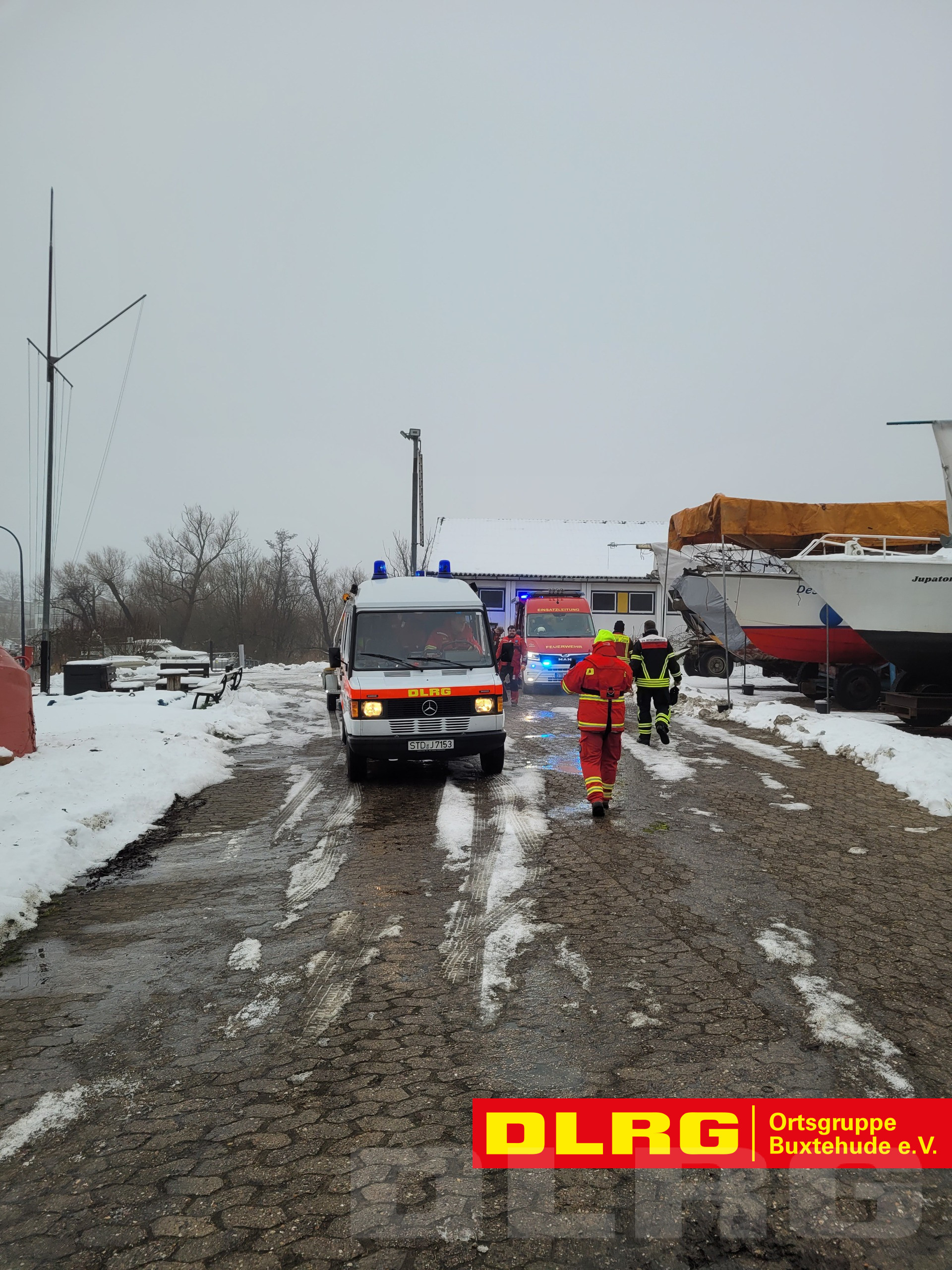 Durch unsere Einsatzkräfte wurde das MZB Swinegel im Buxtehuder Hafen zu Wasser gelassen und verlegte in Richtung der gemeldeten Einsatzstelle. Gemeinsam mit dem Boot der Feuerwehr Estebrügge wurde der Schlengel gesichert und in den Auslauf eines Schöpfwerks zwischen Estebrügge und Buxtehude geschleppt. Mit Hilfe der Einsatzkräfte der DLRG Horneburg wurde der Anleger dann durch Feuerwehrkräfte mit von benachbarten Landwirten hinzugezogenen Traktoren an Land gezogen.